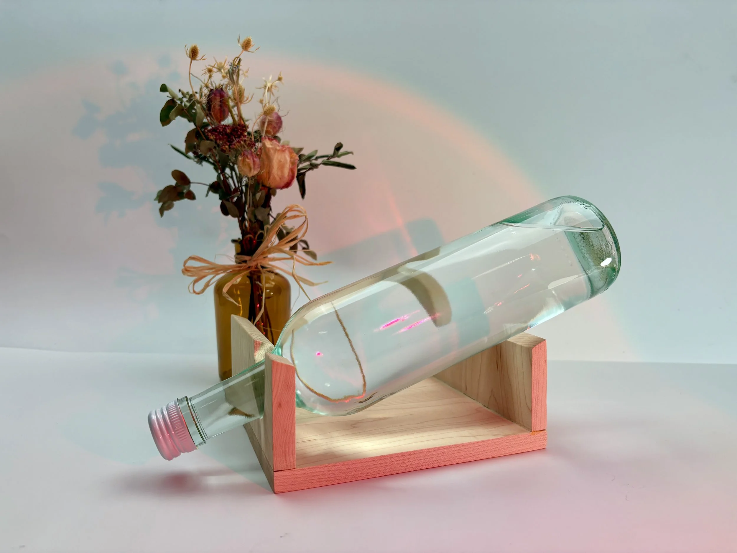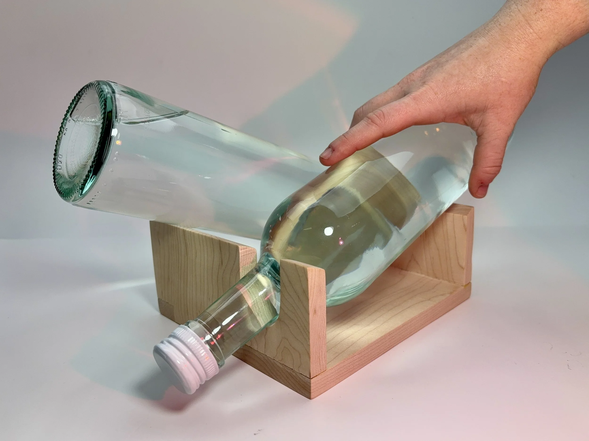 How to make the bottle float and supported at the same time? How can wood be used to enhance the piece?